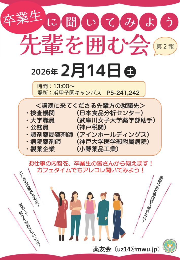 第1報に続き、武庫川女子大学薬学部をご卒業された先輩方による就職講演『先輩を囲む会』の開催時間・先輩方の職種をお知らせいたします!